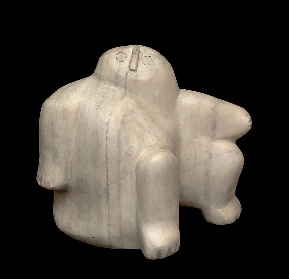 Latcholassie Akesuk, Tudlik’s son, also carved abstract owls. The Latcholassie carving shown here is a rare Inuit sculpture in white marble, as well as being one of the greatest of all Latcholassie’s remarkable work. Unlike Tudlik’s owl, Latcholassie’s is a shaman owl with human arms and legs.