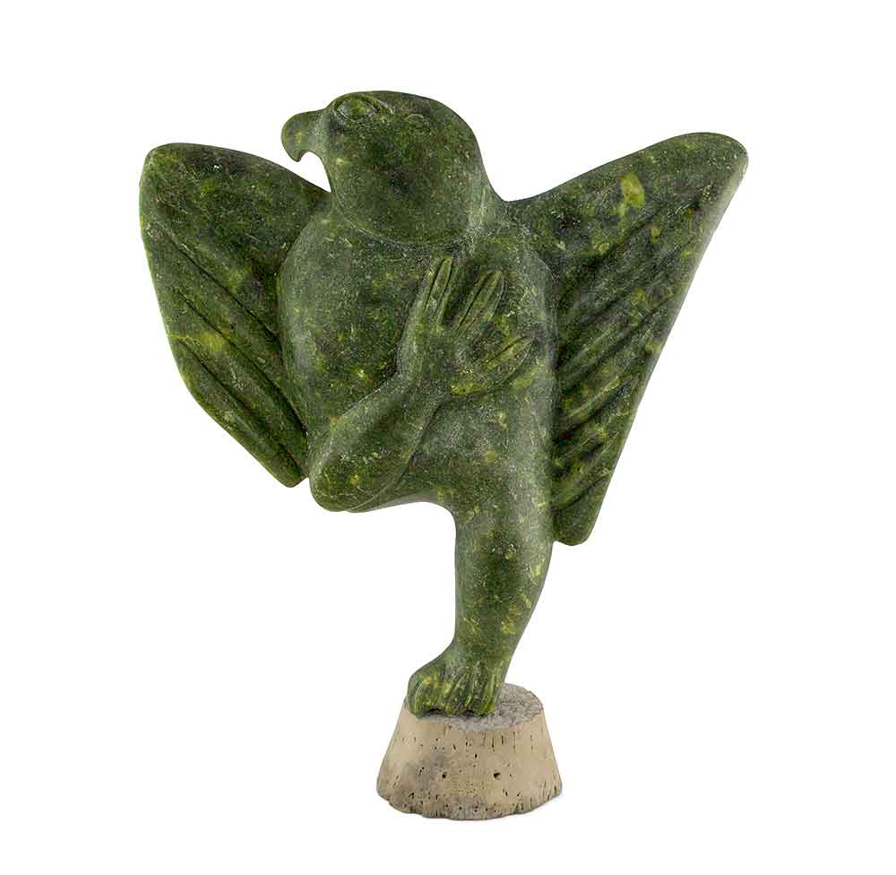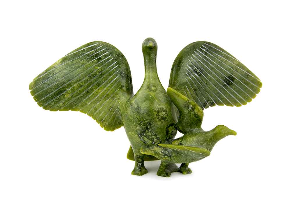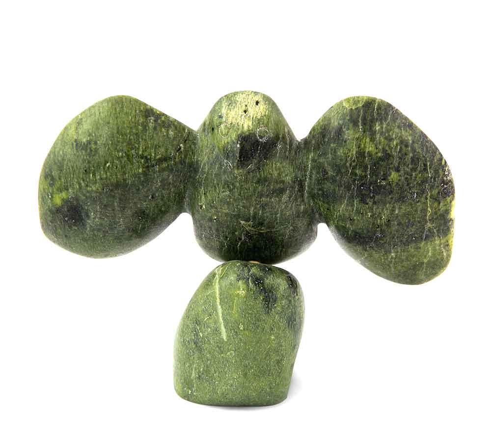 Another bird sculpture shows the unmistakable style of Abraham Etungat. The beautiful green serpentine stone and outstretched wings with distinctive markings – a proudly standing bird – is typical of Etungat. In this particular piece, a smaller, baby bird is present as well, which makes this elegant carving unique and rare.