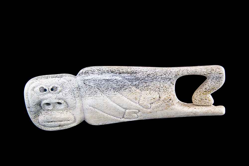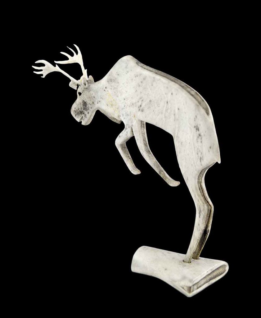 The caribou sculpture by Jacob Irkok, typical of this artist, is very different from that of Andy or Lutka, as well as being a striking and original carving. Irkok carves caribou antler rather than stone. This caribou has a flatness that is not present in the others and has a strong presence by its form and simplicity.