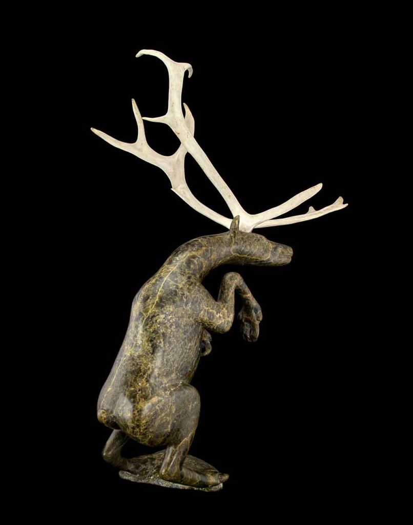 I acquired the beautiful caribou by Lutka Qiatsuk from Alma Houston in her gallery in Nova Scotia. One of several remarkable features of this carving is the artistic license in making such large antlers, which in my opinion adds to the striking appearance of this sculpture.